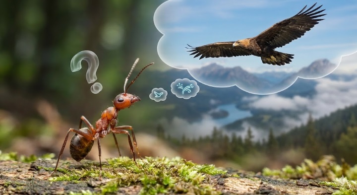Würde so eine kleine Ameise stehen bleiben, hätte sie nämlich Zeit. Erstmals Zeit. Und könnte nach oben gucken. Könnte dort oben einen Adler sehen, ein Tier, tausendfach schwerer als so eine kleine Ameise, was dennoch... schwebt, fliegt, pfeilschnell 100te von Kilometern. Da könnte doch so eine kleine, arme Ameise ins Grübeln kommen und könnte neidisch fragen: "Wie macht der das? Was macht denn der da oben?"
