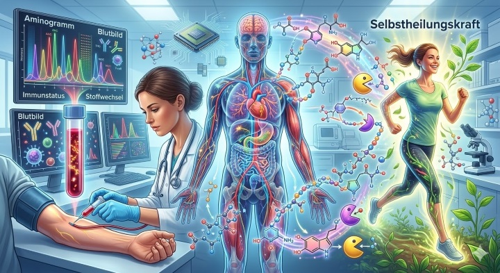 Wir betrachten also nicht mehr nur die Hardware, sondern die Software: die Steuerungssysteme, die kleinsten Einheiten, die Energieflüsse und den Stoffwechsel. Spuren dieser Regelkreise finden wir im Blut. Dort können wir Hormone, Enzyme und Ihren Immunstatus messen – gebaut aus Aminosäuren – die unsere Selbstheilung anstoßen, unsere Leistungsfähigkeit bestimmen, unsere Lebensqualität ausmachen.