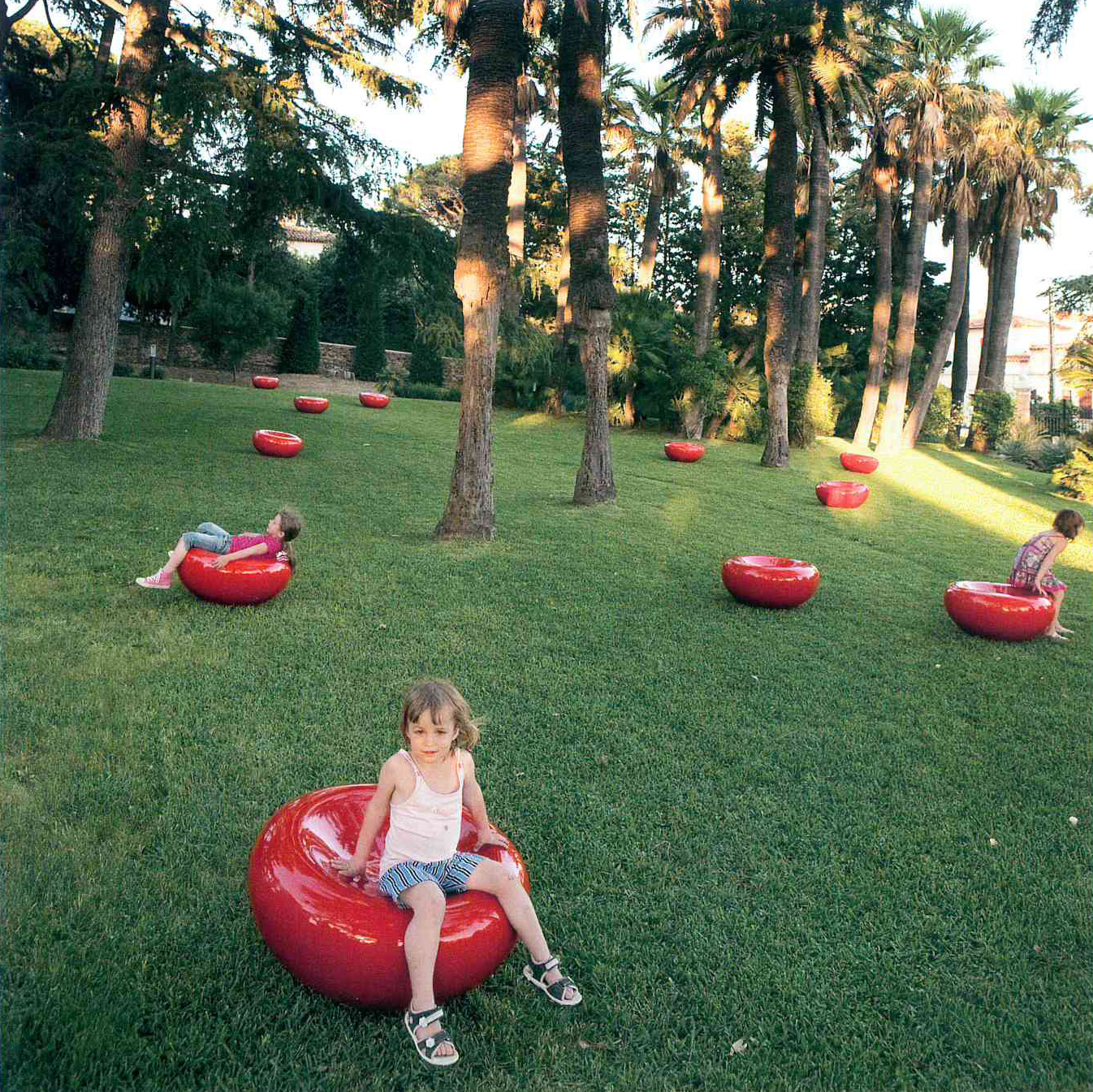 Die glatten, weichen roten Gebilde auf dem grünen Gras unter blauem Himmel. Kinder setzen sich einfach drauf. Kinder. Natürlich.