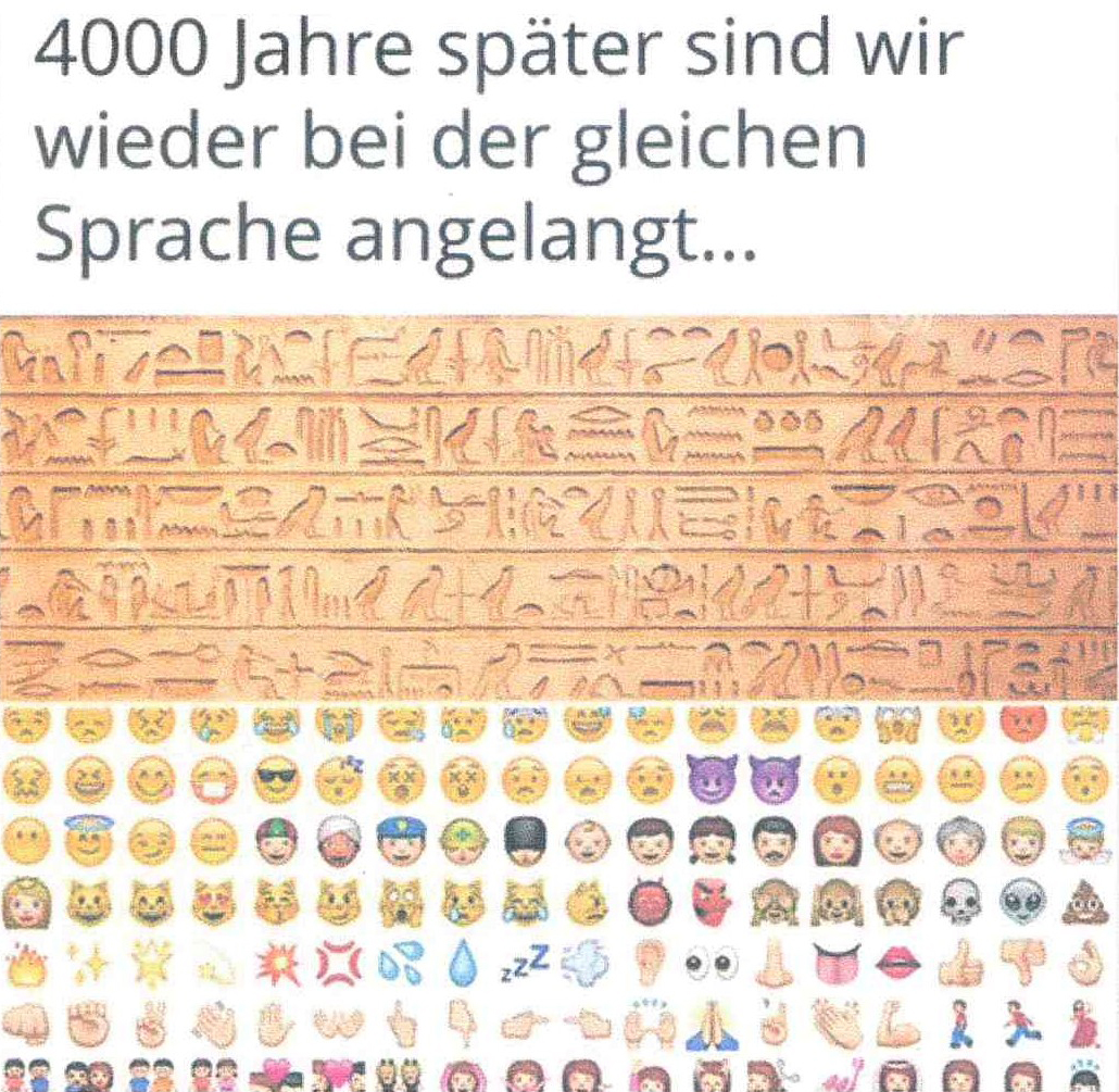 Der Mensch wurde zu Mensch, als er die Schrift entwickelte. Und immer weiter entwickelte. Von primitiven Tontafel-Kerben bis, sagen wir, die heutige Computerschrift. Beweis für die Weiterentwicklung des Menschen, seines Geistes.