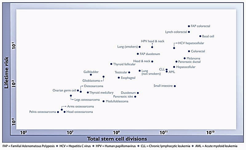 Krebs ist zu 2/3 Zufall. Denn hier geht es natürlich um Mutationen, die zufällig eintreten, und zwar umso häufiger, je häufiger so eine Zelle sich teilt. Hat also nichts mit Rauchen oder Alkohol oder Übergewicht zu tun. Allenfalls zu 1/3 oder weniger.