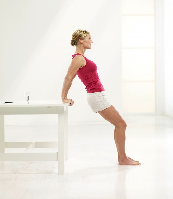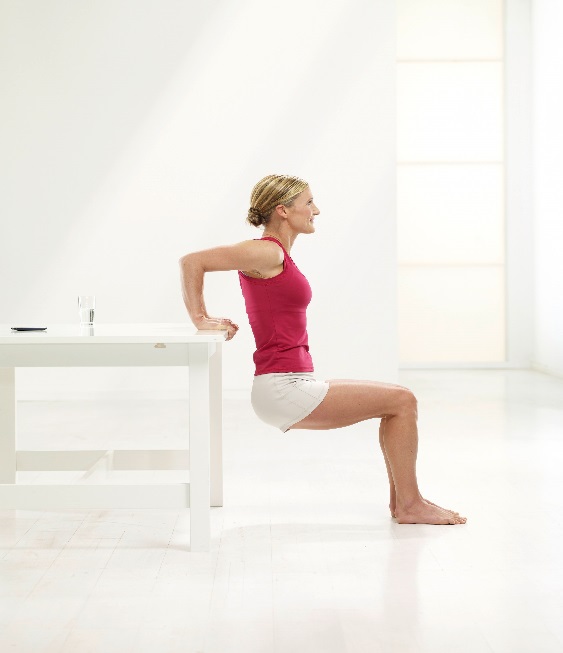 Stellen Sie sich mit dem Rücken vor einen Tisch (ohne Rollen). Legen Sie die Handflächen schulterbreit hinter sich an die Tischkante. Wandern Sie mit den Füßen etwa 80 Zentimeter vom Tisch weg (den Abstand ein wenig ausprobieren).