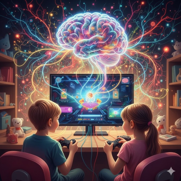 Kinder trainieren mit Computerspielen ihr Gehirn - Bild mit Gemini generiert