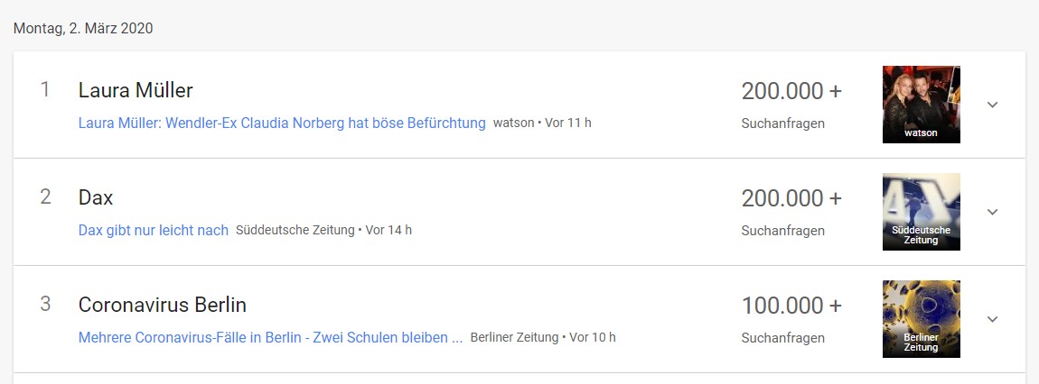 Wenn Laura Müller wichtiger ist als unsere Wirtschaft und andere Nebenschauplätze, dann geht es uns noch gut. Am 2. März war Frau Müller die meistgesuchte Google Kategorie in Deutschland. Gefolgt von der Dax Kategorie und der Coronavirus Berlin Kategorie (siehe Grafik unten).