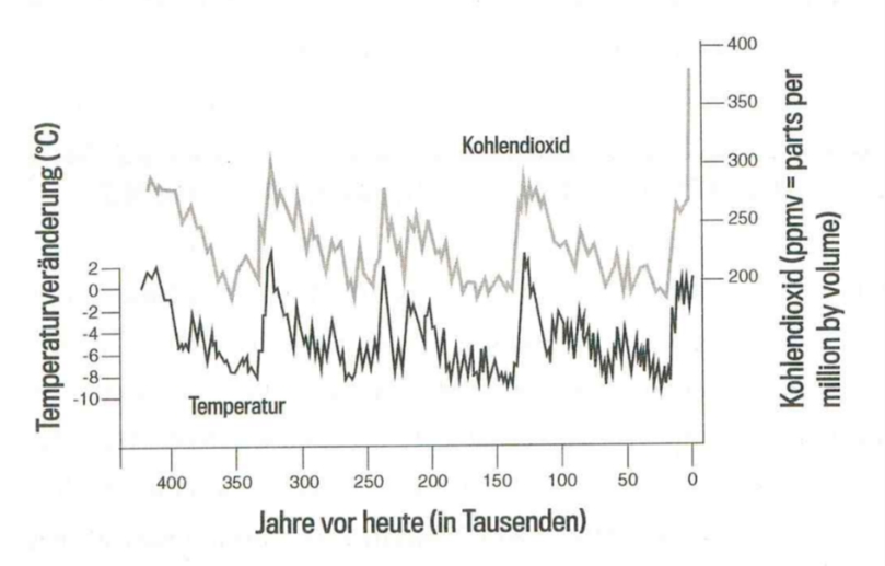 Ein glänzendes Hilfsmittel, um die Vergangenheit zu studieren. Da werden lange, lange Zylinder aus dem Südpolareis gebohrt und Zentimeter für Zentimeter, Millimeter für Millimeter studiert. Was man abliest? Ganz präzise Temperatur und CO₂-gehalt damals. Vor Hunderttausend, vor Dreihunderttausend, vor Vierhunderttausend Jahren. Was man findet ist eindeutig, klar, überzeugend. Wurde vom Präsidentschaftskandidaten Al Gore als Schautafel an die Wand geworfen. Hat auch jeden überzeugt. Gucken Sie hin.