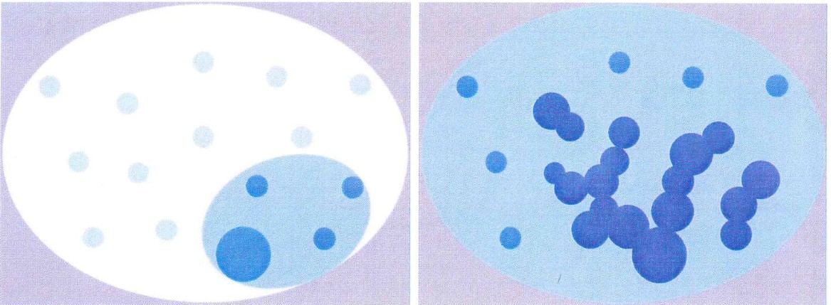 Das hellblaue Gebiet solle den gescannten Informationsraum darstellen. Die dunkleren Felder sind Gebiete gesteigerten Interesses. Links sieht man wenig Interessensgebiet und keine Vernetzung. Rechts erkennt man vielseitige Interessen und geradezu zwangsläufig eine starke Vernetzung. Menschen mit eingeschränktem Horizont können einem überall begegnen, auch im Beruf. Man spricht dann von Fachidioten. Im rechten Bild wird auch deutlich, warum der Begriff Querdenker ebenso eindimensional und falsch ist wie der des "Linear- und Längsdenkers". Geringfügig besser wäre die Bezeichnung "Kreuz und Querdenker". Aber auch er beschreibt die Komplexität, die Struktur und die Vielseitigkeit des vernetzten Denkens nur höchst unvollkommen.