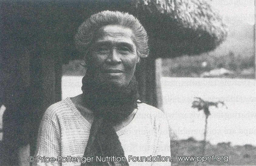 So erklärt man heute ("modern research") das Foto einer 90-Jährigen Polynesierin, aufgenommen 1930 von dem berühmten Zahnarzt Dr. Price. Ich hab das Bild vor mir. Da ist niemand 90. Da ist jemand 50. Ein glattes, glänzendes Gesicht, volle Haare, innere Kraft. Unglaublich.