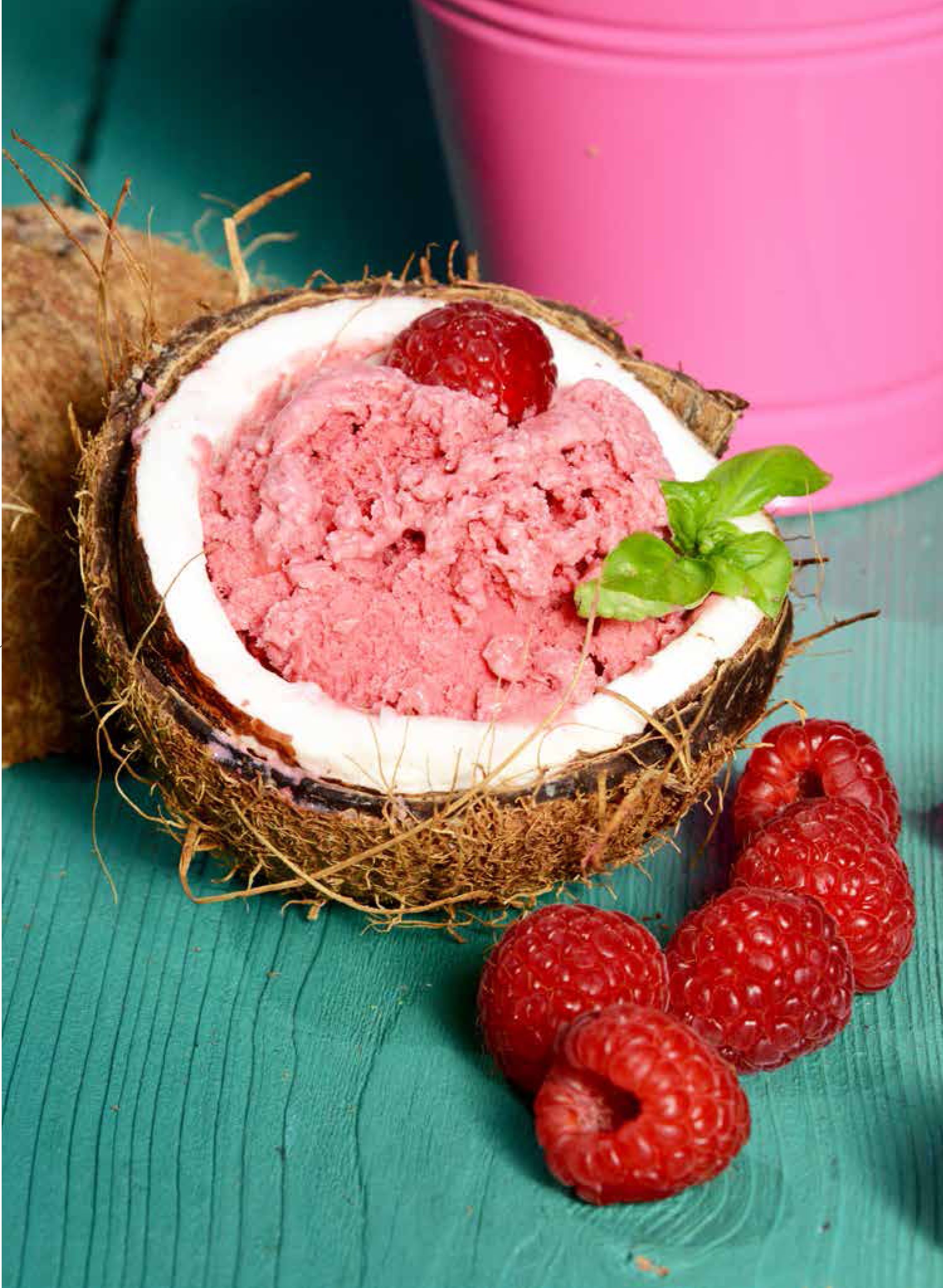 Himbeeren verlesen, nur wenn nötig kurz abbrausen und einige Himbeeren als Verzierung beiseitelegen. Übrige Himbeeren in ein hohes Gefäß oder in den Standmixer geben. Joghurt, Kokoszucker und Limettensaft dazugeben und alles mit dem Schneidstab oder im Mixer pürieren, bis eine cremige Eismasse entsteht