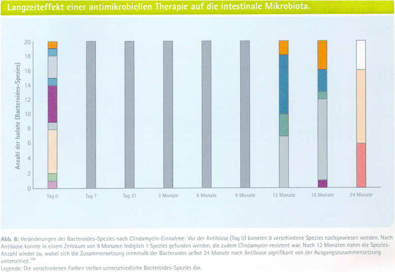 Für mich so erschreckend die unten stehende Abbildung. Die mir das erste Mal klargemacht hat, was 10 Tage Clindamycin (ein Antibiotikum) im Darm anrichtet: Nämlich 9 Monate tödliches Schweigen im Darm. Keine Flora mehr. Und selbst 12, 18, 24 Monate später immer noch ein völlig gestörtes Bild. Und das nach einmaliger Antibiotika-Gabe. Wussten Sie das? Antibiotika bekommen wir bereits als Kinder. Jetzt erstmals wir mir klar, was wir da in unserem Inneren, im Darm wirklich anrichten. Und zwar auf Dauer anrichten.