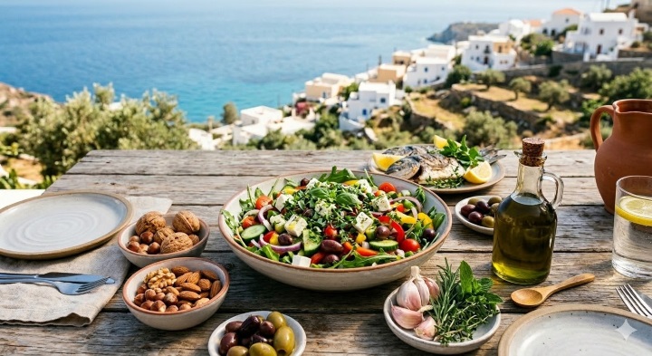 Gesunde und leckere Kost aus dem Mittelmeer ohne Kohlenhydrate - Bild mit Gemini generiert