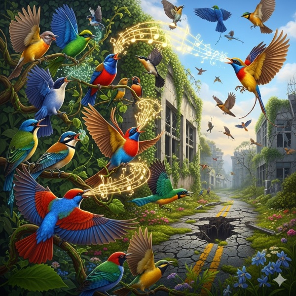Der Gesang der Vögel nach dem "Weltuntergang" - Bild mit Gemini generiert