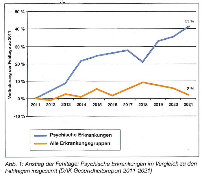 Heißt übersetzt: In den letzten 10 Jahren haben die Fehltage (ein wundervolles Maß!) durch Krankheiten sich praktisch nicht verändert. Greift man allerdings nur die psychischen Erkrankungen heraus, so sind die massiv angestiegen (um 41%). Hintergrund? Dauerstress in jeder denkbaren Form.