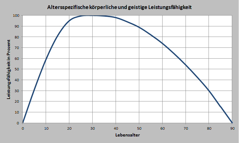 Dass die körperliche und geistige Leistungsfähigkeit von Geburt an zunimmt, Mitte zwanzig einen Höhepunkt erreicht, und mit zunehmendem Alter wieder abnimmt, bedarf eigentlich keiner weiteren Erklärung. Dass die Kurve bei jedem Menschen individuell anders verläuft ist ebenfalls selbstverständlich. Es gibt aber einige Parallelen zwischen dem ansteigenden und dem absteigenden Ast, die es wert sind, näher beleuchtet zu werden.