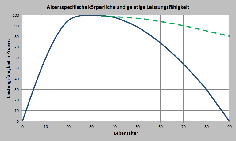 Obacht! Mit Verallgemeinerungen in der hier gezeigten Art muss man sehr sehr vorsichtig sein. Das Diagramm besitzt schon eine gewisse Worst-Case Charakteristik. Der Verlauf sieht, wie gesagt, bei jedem Menschen anders aus. Es soll auch Leute geben, die das genaue Gegenteil beweisen, die auch im hohen Alter geistig und körperlich topfit sind. Diese Menschen sind im Diagramm als grün-gestrichelte Linie eingezeichnet.