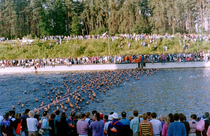 Schwimmstart der ersten Teilnehmergruppe beim Ironman Europe 1990 in Roth - Bildquelle: Wikipedia / Fotograf ANKAWÜ
