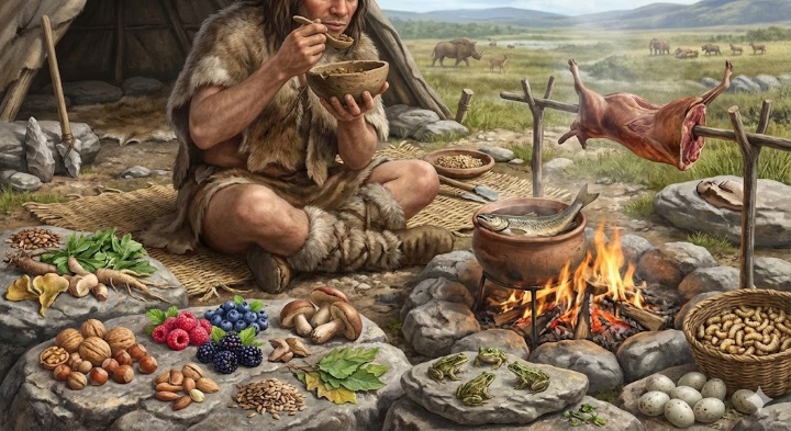 Kost des Steinzeitmenschen - Bild mit Gemini generiert