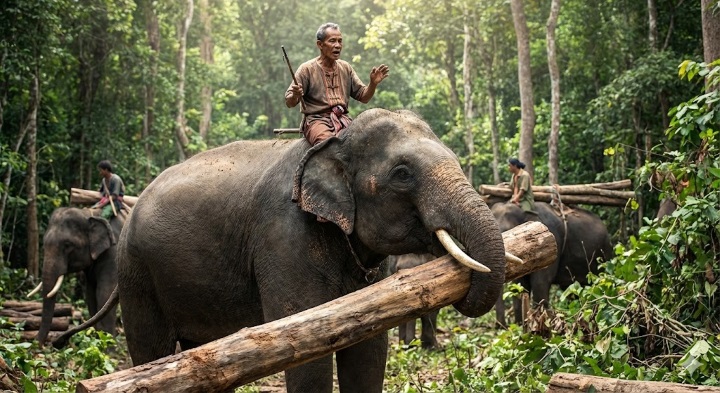 Als Mahut wird der Eigentümer eines Arbeitselefanten bezeichnet. Der sitzt da oben auf dem riesigen grauen Tier. Gibt dem Elefanten Befehle, der Elefant führt sie aus.